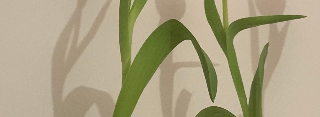 De drankjes waren opgedronken, hadden goed gesmaakt en wat overbleef waren de lege flesjes. Ik vond ze zo schattig dat ik besloot om ze niet in de glasbak te gooien. Ze leenden zich prima als vaasje voor een enkele bloem. Ik haalde drie tulpen uit een bos van tien en zette drie flesjes, elk voorzien van een tulp, op een rijtje bovenop een kast. Stond hartstikke leuk maar het werd pas echt interessant toen ik een lamp op het rijtje richtte. Met de slagschaduwen erbij ontstond een compositie die mij uitnodigde om foto´s te maken. Bovenstaande foto heb ik bewerkt door een flesje met bloem eraf te snijden. Wel bleef de slagschaduw van dit verwijderde flesje op de foto zichtbaar. Dit maakte voor mij de foto de moeite waard. Onverwachts had ik zo ´s avonds een heerlijk creatief uurtje.
